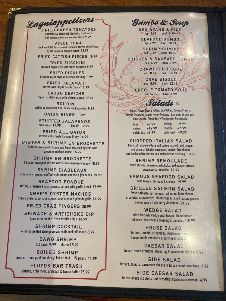 Floyds - Pearland is a Cajun/Creole, seafood, and steakhouse spot in Pearland, TX. With various amenities like outdoor seating, free Wi-Fi, and a full bar, it caters to a range of diners. The menu showcases lagniappetizers like Ayeee Tuna and Boudin Boulettes, flavorful Gumbo & Soup options, and refreshing Salads like the Famous Seafood Salad. Customers rave about the food and service, with standout dishes like the Fried Avocado Crab Salad and Crawfish Etouffee leaving a lasting impression. The atmosphere, music, and attentive staff enhance the overall dining experience. Floyds - Pearland is a go-to spot for delicious and satisfying meals in a welcoming environment.